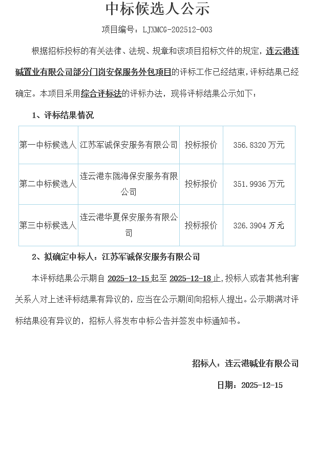 連云港連堿置業(yè)有限公司部分門(mén)崗安保服務(wù)外包項(xiàng)目中標(biāo)候選人公示