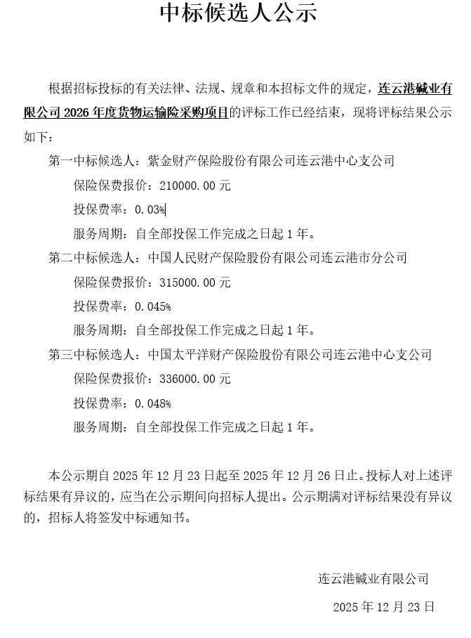 連云港堿業有限公司2026年度貨物運輸險采購項目中標候選人公示