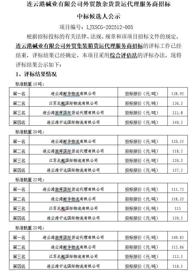 連云港堿業有限公司外貿集裝箱貨運代理服務商招標中標候選人公示