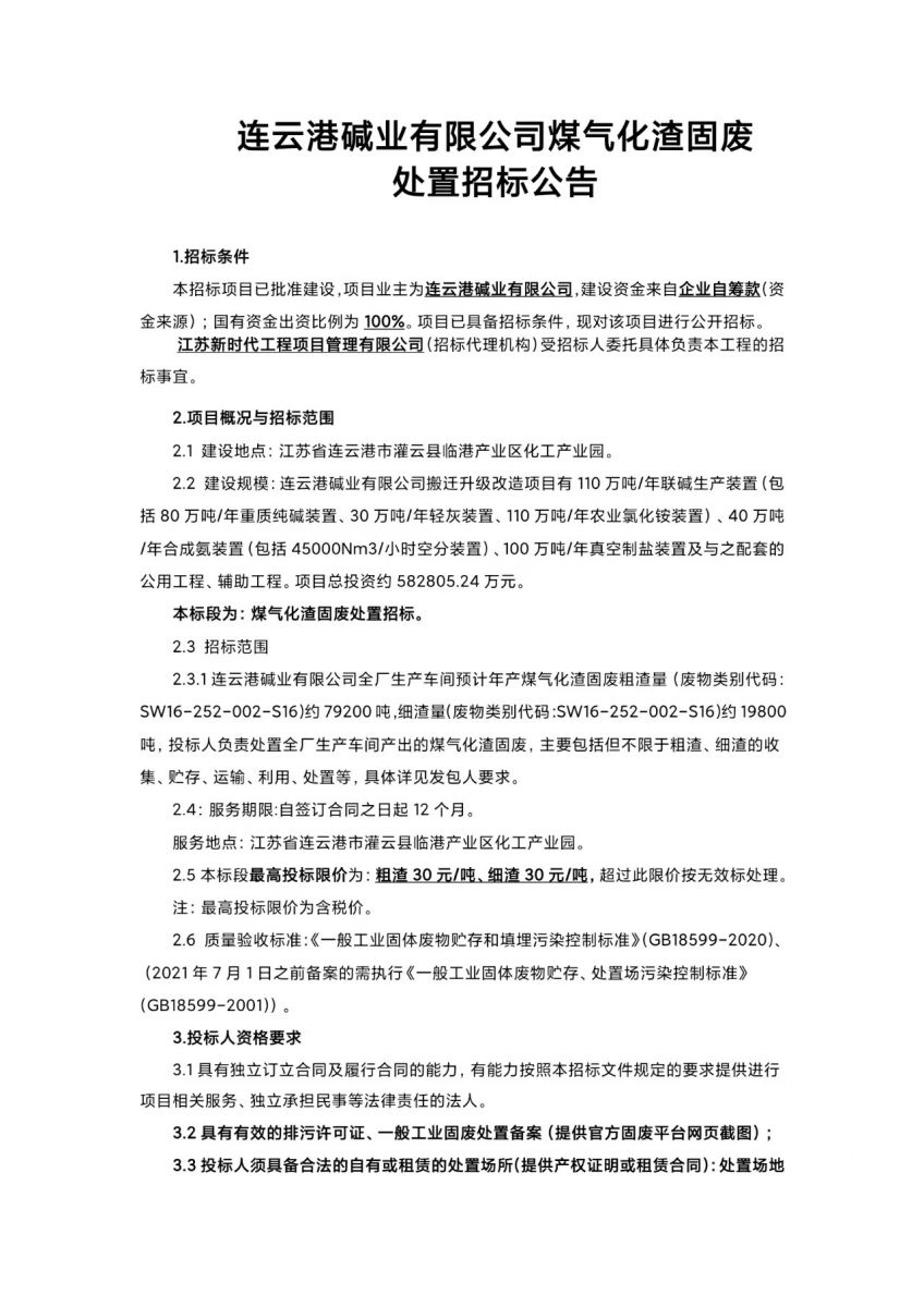 連云港堿業有限公司煤氣化渣固廢處置招標公告